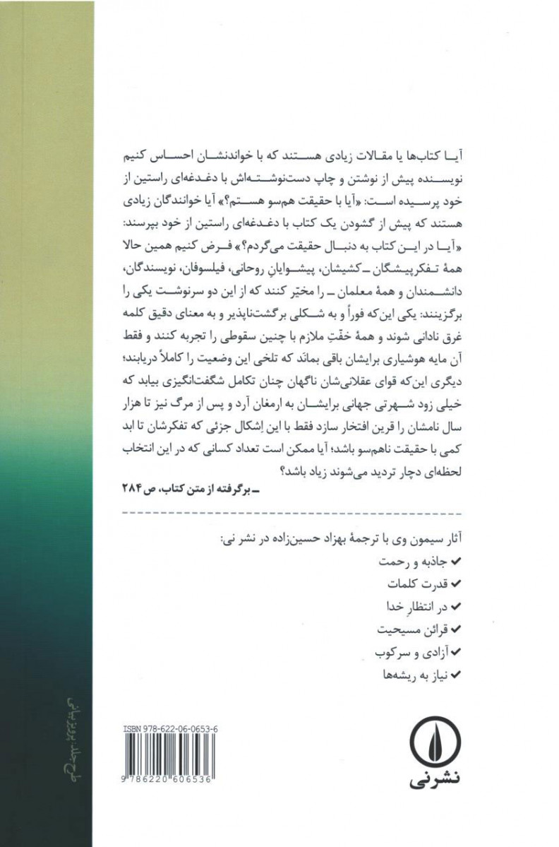 آیا کتاب ها یا مقالات زیادی هستند که با خواندنشان احساس کنیم نویسنده پیش از نوشتن و چاپ دست نوشته اش با دغدغه ای راستین از خود پرسیده است: «آیا با حقیقت هم سو هستم؟ آیا خوانندگان زیادی هستند که پیش از گشودن یک کتاب با دغدغه ای راستین از خود بپرسند: «آیا در این کتاب به دنبال حقیقت میگردم؟» فرض کنیم همین حالا همه تفکر پیشگان- کشیشان، پیشوایان روحانی، فیلسوفان، نویسندگان، دانشمندان و همه معلمان - را مخیر کنند که از این دو سرنوشت یکی را برگزینند: یکی این که فوراً و به شکلی برگشت ناپذیر و به معنای دقیق کلمه غرق نادانی شوند و همه خفت ملازم با چنین سقوطی را تجربه کنند و فقط آن مایه هوشیاری برایشان باقی بماند که تلخی این وضعیت را کاملاً دریابند؛ دیگری این که قوای عقلانیشان ناگهان چنان تکامل شگفت انگیزی بیابد که خیلی زود شهرتی جهانی برایشان به ارمغان آرد و پس از مرگ نیز تا هزار سال نامشان را قرین افتخار سازد فقط با این اشکال جزئی که تفکرشان تا ابد کمی با حقیقت ناهمسو باشد؛ آیا ممکن است تعداد کسانی که در این انتخاب لحظه ای دچار تردید میشوند زیاد باشد؟