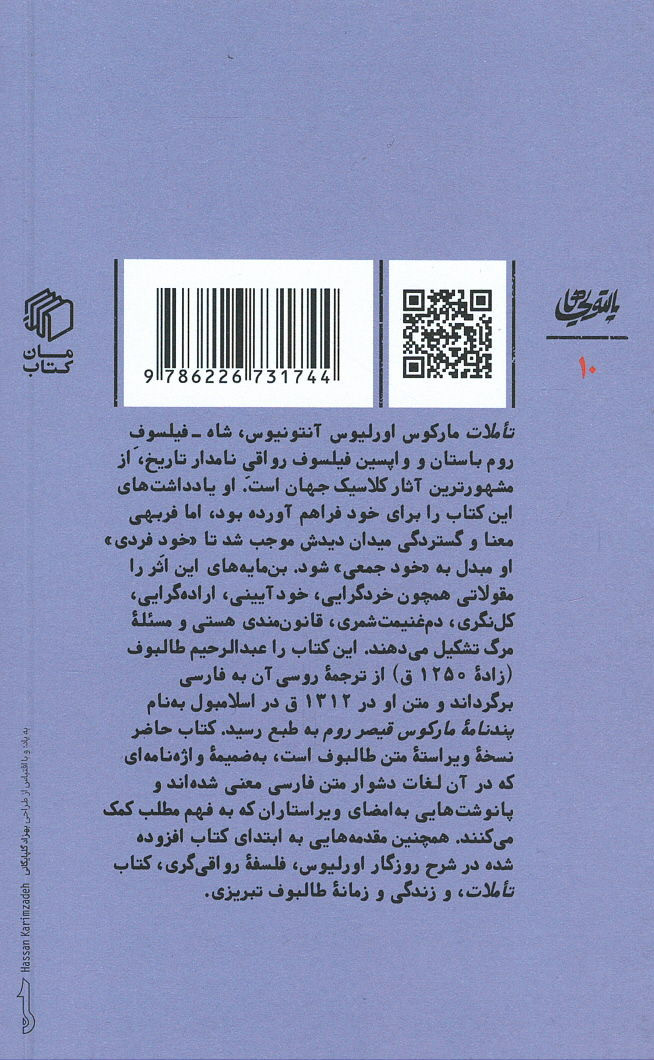 تأملات مارکوس اورلیوس آنتونیوس شاه - فیلسوف روم باستان و واپسین فیلسوف رواقی نامدار تاریخ از مشهورترین آثار کلاسیک جهان است. او یادداشتهای این کتاب را برای خود فراهم آورده بود اما فربهی معنا و گستردگی میدان دیدش موجب شد تا «خود فردی» او مبدل به «خود جمعی» شود بن مایههای این اثر را مقولاتی همچون خردگرایی، خود آیینی، اراده گرایی، کل نگری، دم غنیمت، شمری قانون مندی هستی و مسئله مرگ تشکیل میدهند. این کتاب را عبدالرحیم طالبوف (زاده ۱۲۵۰ ق) از ترجمه روسی آن به فارسی برگرداند و متن او در ۱۳۱۲ ق در اسلامبول به نام پندنامه مارکوس قیصر روم به طبع رسید. کتاب حاضر نسخه ویراسته متن طالبوف است به ضمیمه واژه نامهای که در آن لغات دشوار متن فارسی معنی شدهاند و پانوشتهایی به امضای ویراستاران که به فهم مطلب کمک میکنند. همچنین مقدمههایی به ابتدای کتاب افزوده شده در شرح روزگار اورلیوس فلسفه رواقی گری کتاب تأملات و زندگی و زمانه طالبوف تبریزی.